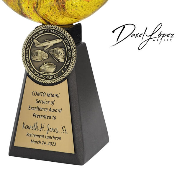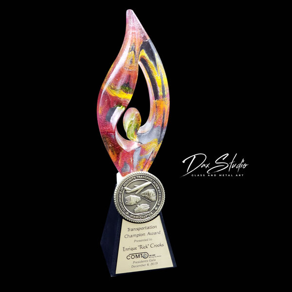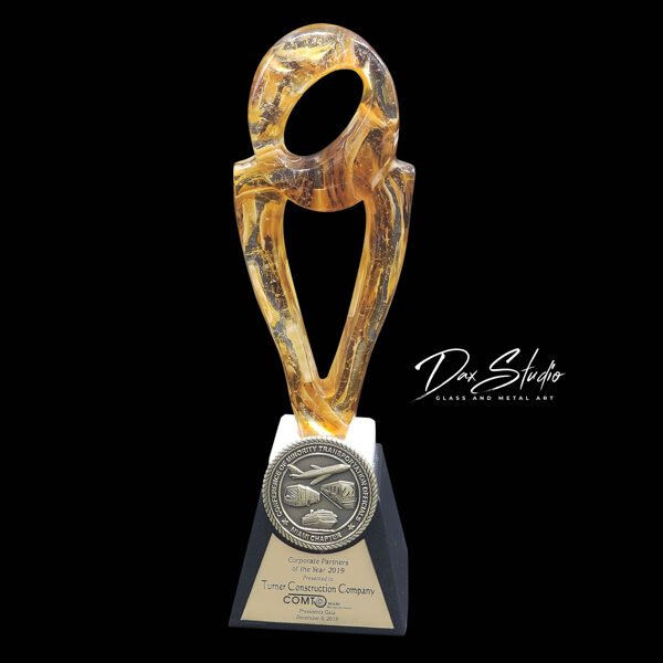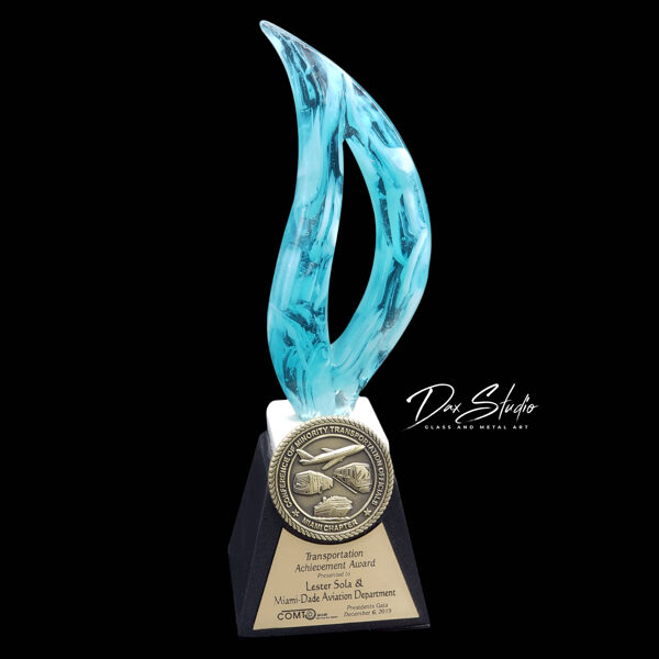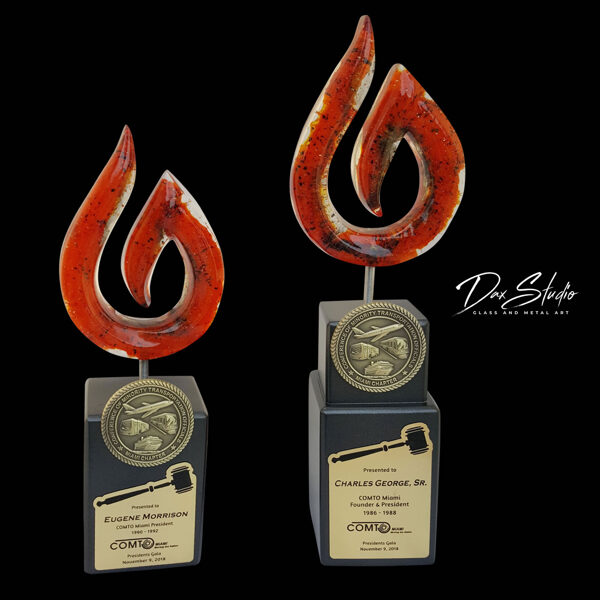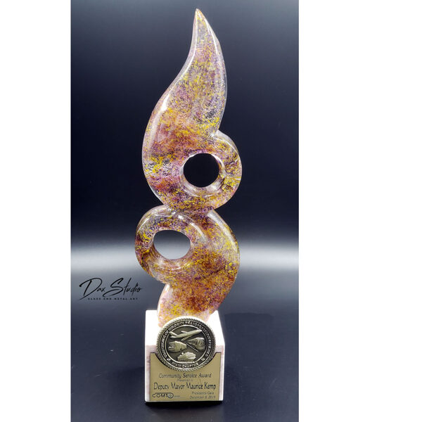 This elegant glass sculpture symbolizes the dynamicflow and transformative journey. The vibrant swirls of